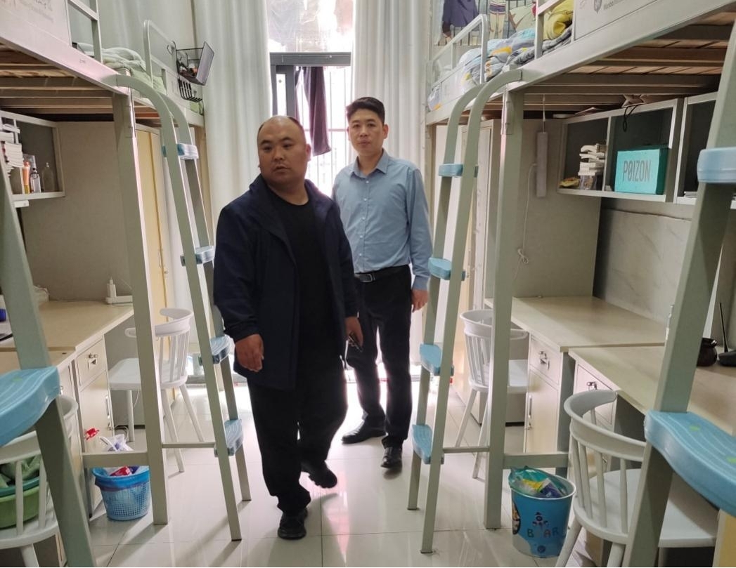 司斌斌、黄吉胜、辅导员与同学们亲切交流,详细了解同学们的学习生活情况,认真查看寝室卫生,逐项排查安全隐患,叮嘱同学们要提高安全意识,严格遵守学校假期学生管理的相关要求,鼓励学生在生活中做好寝室基本内务整理,维护整洁舒适的寝室环境,营造友善和谐的寝室氛围。希望同学们合理规划假期时间,积极参加学校组织的校园文化活动,共度一个“健康、平安、快乐”的五一假期。(图/汪洋