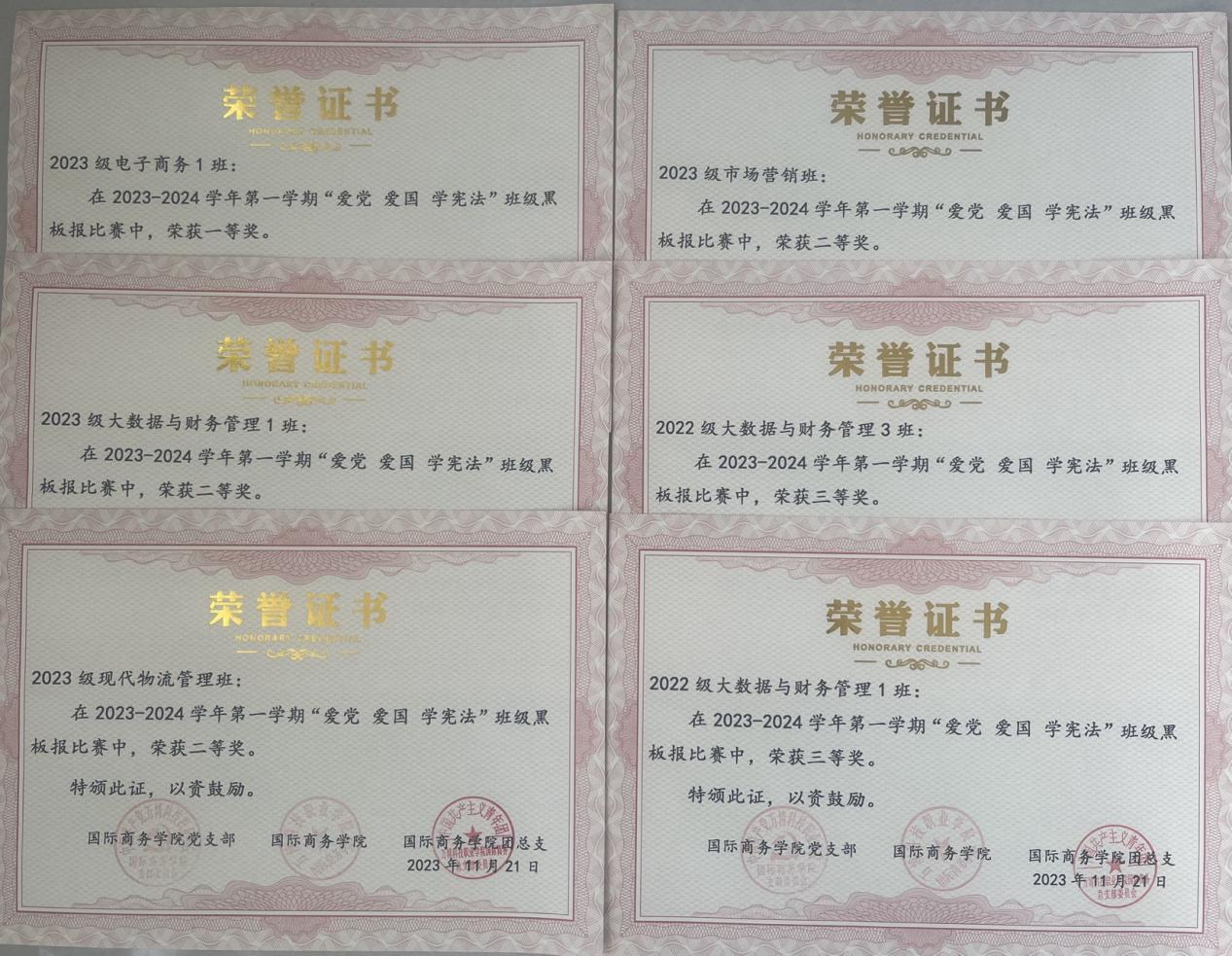 学法以明道,用法以修身。为深入学习贯彻党的二十大精神,进一步弘扬宪法精神,树立宪法权威,营造学习宪法、遵守宪法的良好氛围,国际商务学院党支部、团总支于11月10日至11月22日期间,组织各班级开展了以“爱党 爱国 学宪法”为主题的班级黑板报比赛活动。