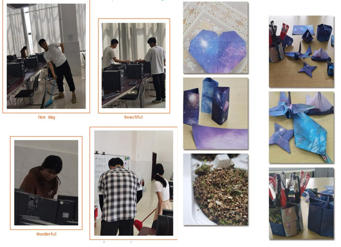 22财管1班的同学在张翠老师组织下,开展了趣味折纸,捏橡皮泥,打扫教室、实验室的劳动实践课程。此次课程不仅培养了学生环保意识,通过实际行动保护环境,还培养了同学们合作意识和沟通能力。