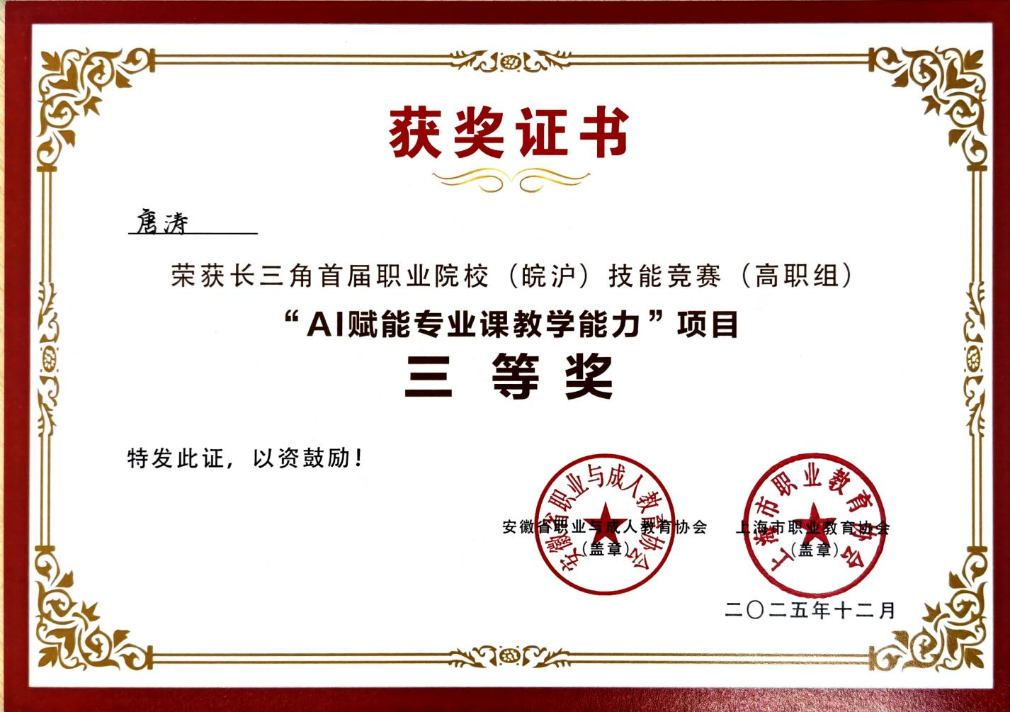 近日,2025年长三角首届职业院校(皖沪)技能竞赛圆满落幕。我校教师凭借扎实的专业能力与出色的教学创新,在竞赛中取得优异成绩,共斩获二等奖、三等奖各一项。其中,基础部陶德力老师在“基础课教学能力”项目中荣获二等奖;交通工程学院唐涛老师在“AI赋能专业课教学能力”项目中获得三等奖。