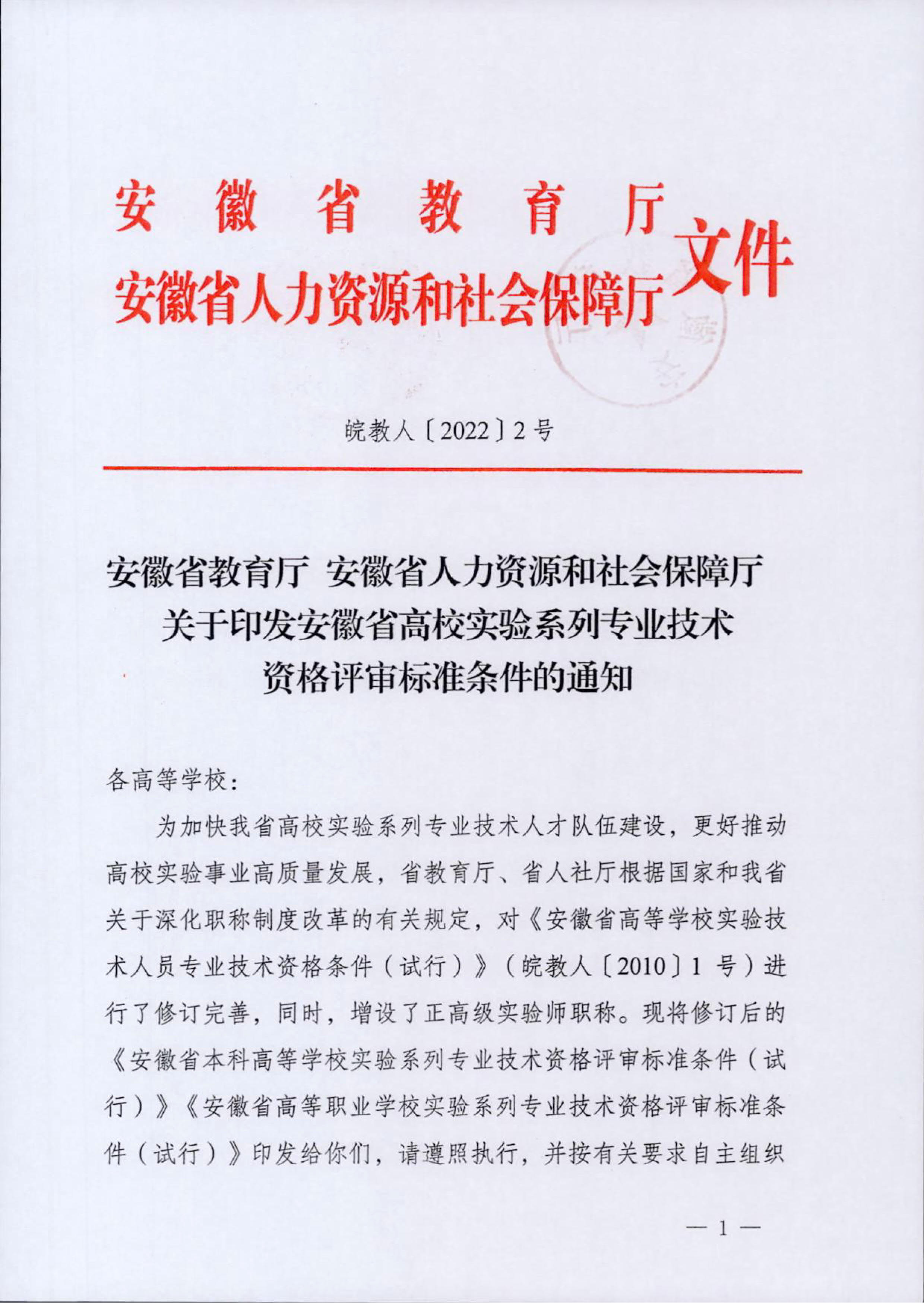 关于印发安徽省高校实验系列专业技术资格评审标准条件的通知